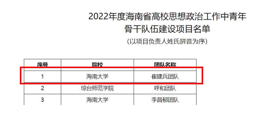 近日,海南省教育厅公布2022年度高校思想政治工作有关培育建设部分项目结果,我院崔建兵老师团队入选2022年度海南省高校思想政治工作中青年骨干队伍(全省每年资助10个团队)。