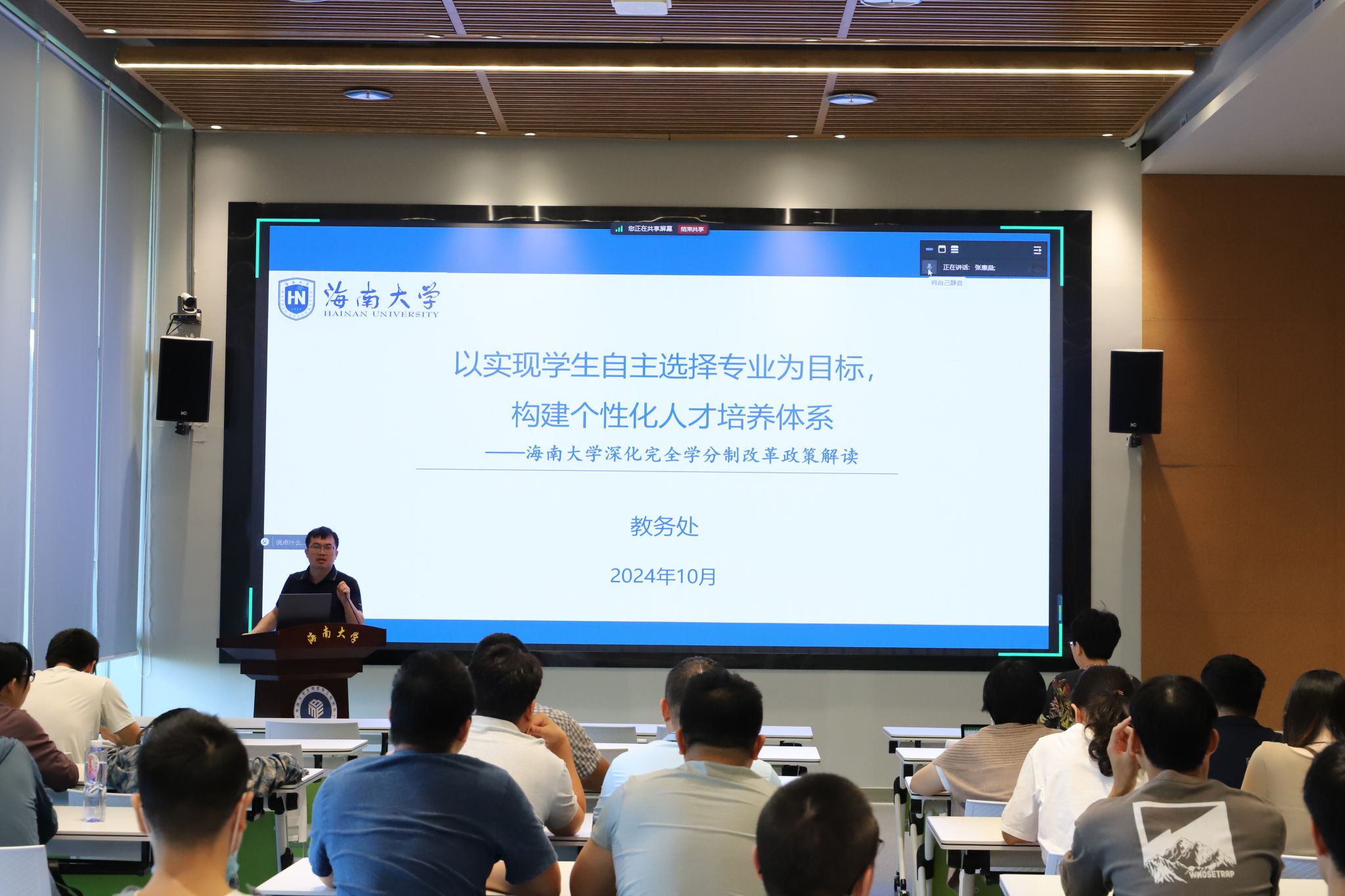 宣讲会上,蔡夫鸿副院长从海南大学为什么要深化完全学分制改革、海南大学完全学分制改革历程、深化完全学分制改革政策及应用场景等方面进行了阐述和解读。详细介绍了课程修读方式和等级制成绩评定体系等多方面,强调数字化平台课程建设的重要性。
