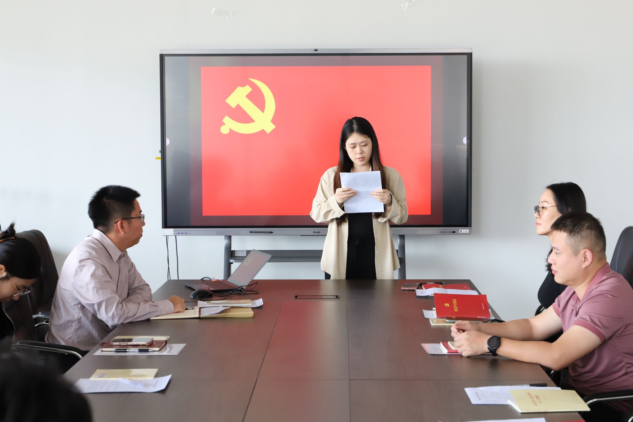 专题会后,教工第二党支部进行了王淼同志的预备党员转正会议。会议由教工第二党支部书记余祥主持,按程序,王淼同志汇报了个人在预备期间的思想、工作情况,田朝阳同志受王淼入党介绍人黄鑫鑫的书面委托,介绍了王淼同志在预备期间的表现情况,并代表支委会介绍了对王淼同志在预备期的教育和考察、转正公示等情况;教工第二党支部与会党员同志就王淼同志的转正情况进行了充分讨论并进行了投票表决,决定通过王淼同志的转正申请并报上级党组织审批。