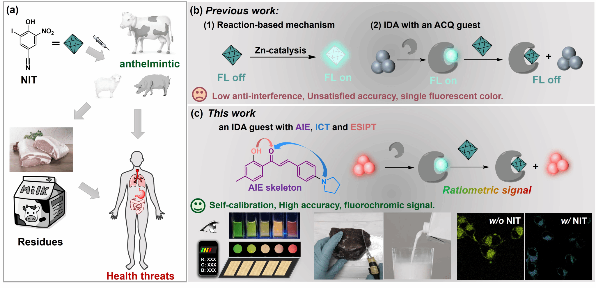 近期,yl9193永利官网朱明强团队研发了一个能快速检测食品样品中兽药硝碘酚腈(NIT)的比率型荧光探针,作者利用探针还实现双通道细胞内NIT成像。此项研究成果以“A ratiometric fluorescent indicator-displacement assay for on-site determination and intracellular imaging of nitroxinil”为题发表于国际期刊《Food Chemistry》(中科院一区,IF: 8.8)。