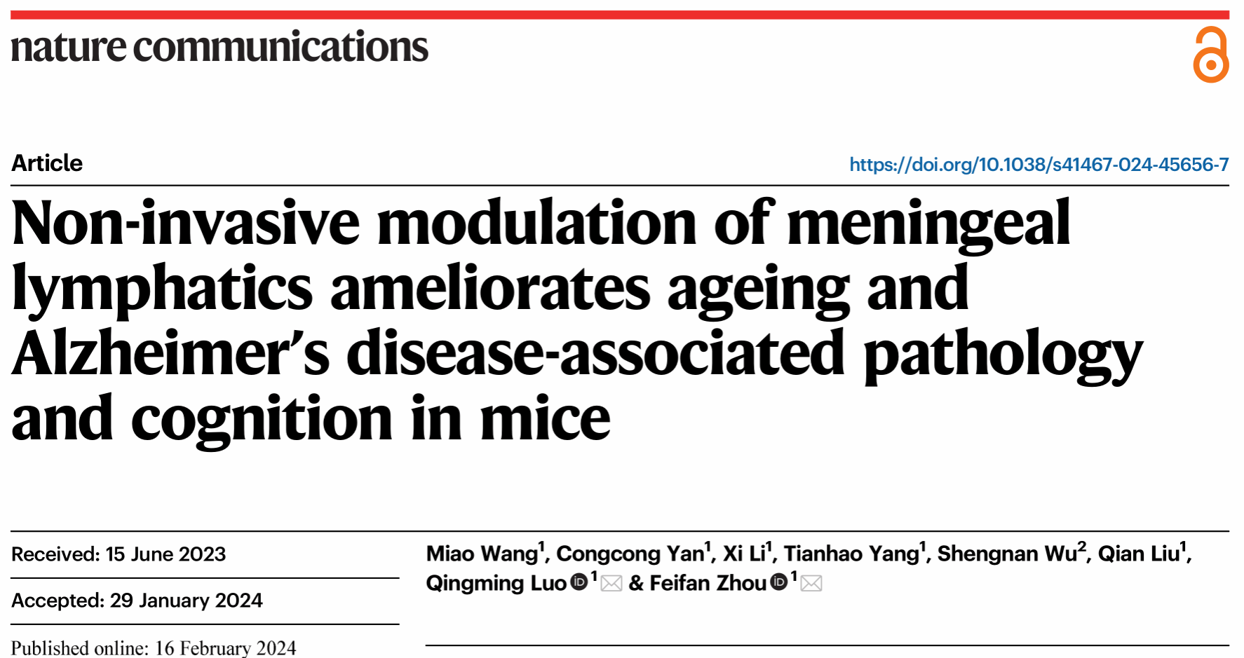 2024年2月16日,《Nature Communications》在线发表(Nat. Commun.15, 1453, 2024)yl9193永利官网周非凡教授团队论文Non-invasive modulation of meningeal lymphatics ameliorates ageing and Alzheimer's disease-associated pathology and cognition in mice。该研究利用近红外激光(808 nm)对衰老及阿尔茨海默病(Alzheimer's disease, AD)小鼠实施无接触经颅光疗,显著提升脑膜淋巴系统引流功能,最终实现小鼠的病理缓解及认知提升。